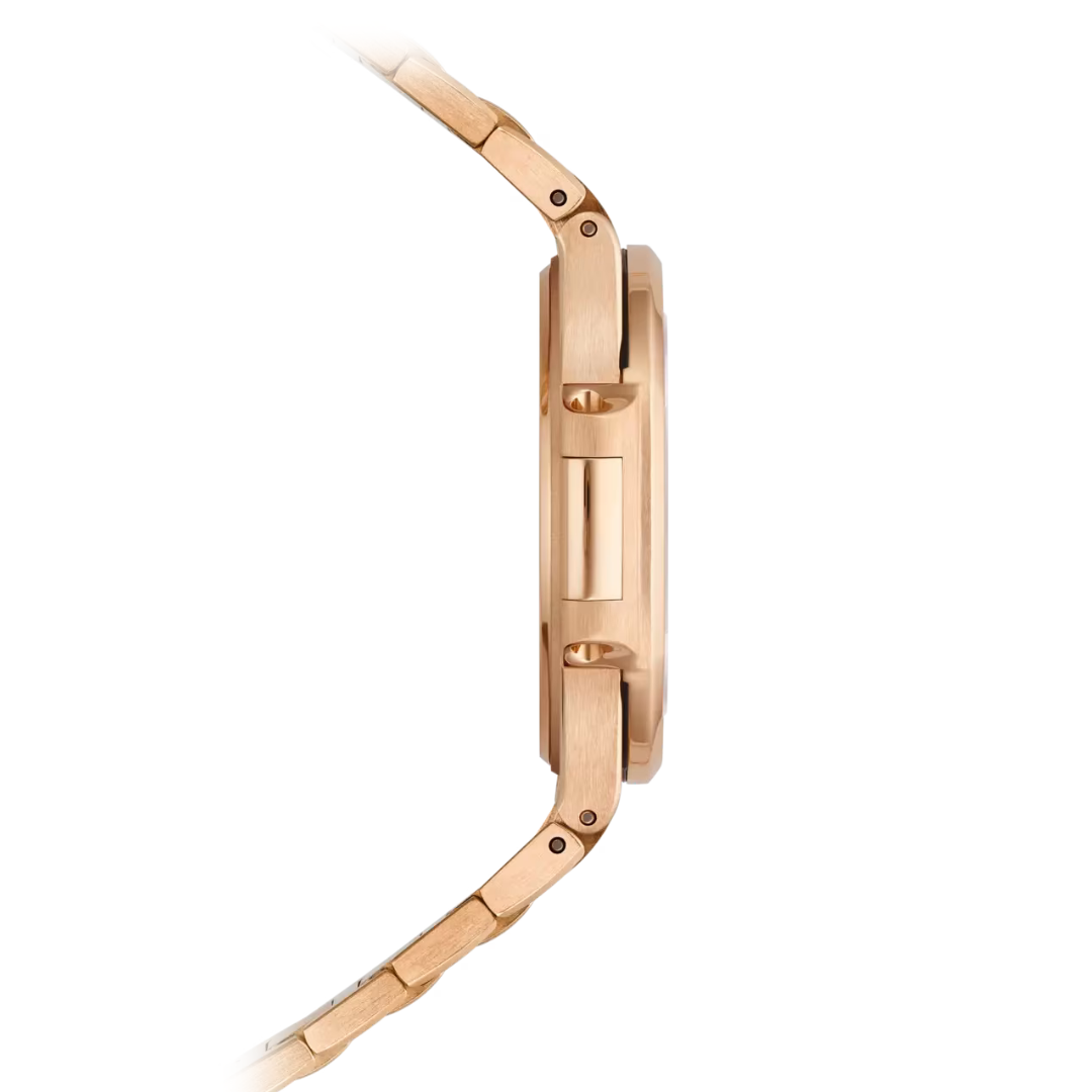 Phần vỏ của Patek Philippe Nautilus 7010/1R-013 được chế tác hoàn toàn từ vàng hồng 18K nguyên khối, mang lại độ bền vượt trội và vẻ đẹp sang trọng theo thời gian.