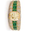 Thiết kế vòng tay thể hiện phong cách kiến trúc táo bạo, nơi tỷ lệ và ánh sáng được kết hợp hài hòa: ánh vàng rực rỡ, sắc ngọc lục bảo tươi sáng, và ánh lửa kim cương lấp lánh.